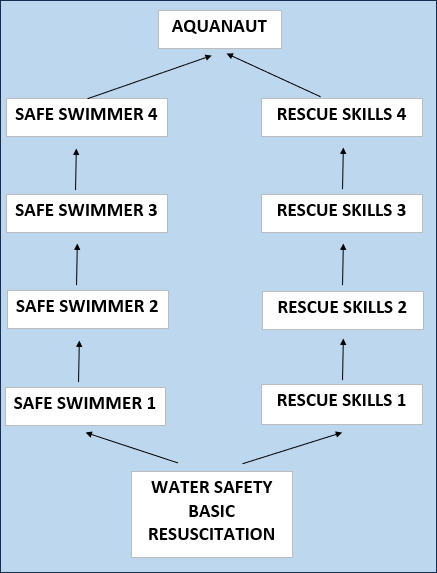 Each of the test sequence is intended to build water confidence and survival techniques. Each time a level is completed, your success is recorded on a certificate. You are then ready to progress to the next level.